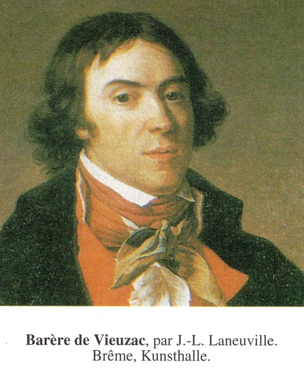 Bibliographie : R. Launay, Barère de Vieuzac, l'Anacréon de la guillotine, 1929.BARÈRE DE VIEUZAC, Bertrand (Tarbes, 1755-id., 1841). Homme politique français. Il fut, lors de la Révolution française, l’un des organisateurs de la Terreur, surnommé « l’Anacréon de la guillotine ». Député aux États généraux (1789) et à la Convention (1792), il dirigea le procès de Louis XVI et vota pour sa mort. Membre du Comité de Salut public, il dirigea la Terreur mais s’opposa bientôt à Robespierre et l’abandonna le 9 Thermidor (27 juillet 1794). Proscrit comme régicide en 1816, il vécut à l’étranger et ne revint en France qu’après 1830.