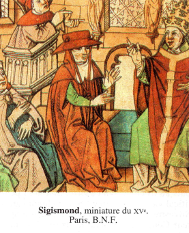 Sigismond (1368-1437) ; roi allemand [1410-1437], roi de Hongrie [depuis 1387] et de Bohême [depuis 1419], empereur romain [1433-1437].